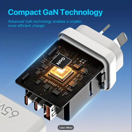 65W GaN Fast Wall Charger for Laptops, Phones, Tablets, Dual USB-C & USB-A