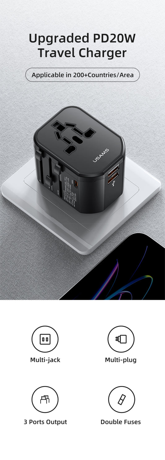 USAMS Universal Travel Adapter Travel Charger Socket Converter 20W Dual USB Type-C Wall Charger For US EU UK AU